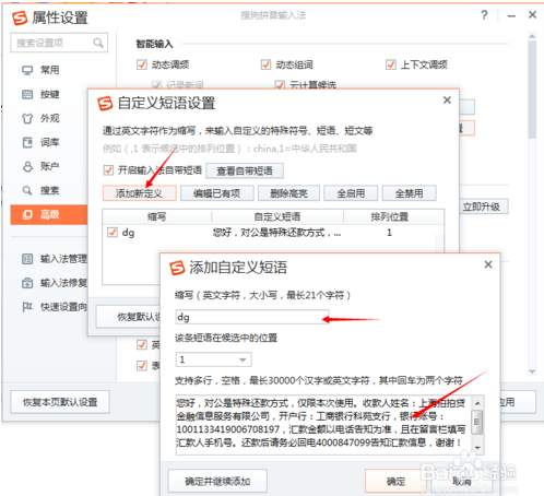 4:然后点击“添加新定义”,这里以对公短信为例(工作中经常需要重复输入的一大段话),缩写栏就填对公的首字母“dg”,然后把对公模板(就是玩家们常用的大段语句输入到这里)复制粘贴到里面,最后就是:确定,应用,保存。