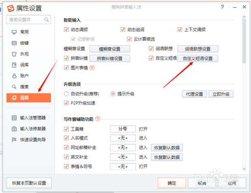 3、“属性设置”里面选择“*”,然后点击”自定义短语设置“: