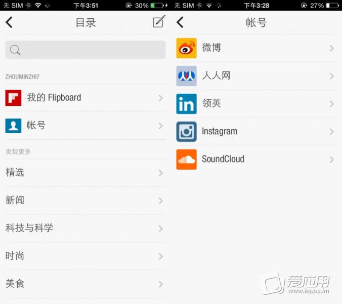 在 Flipboard 上,你可以同时刷微博和查看订阅频道。而这里的微博和文章依然遵循杂志般的排版!选择右上方的“红丝带”按钮,弹出的目录页面选择“帐号”,会弹出两个分栏,由上而下分别是我的 Flipboard 和“账号”。Flipboard 帐号是刚才注册的账号;添加帐号是指可添加的第三方帐号,包括:新浪微博,人人网,Instagram 等。