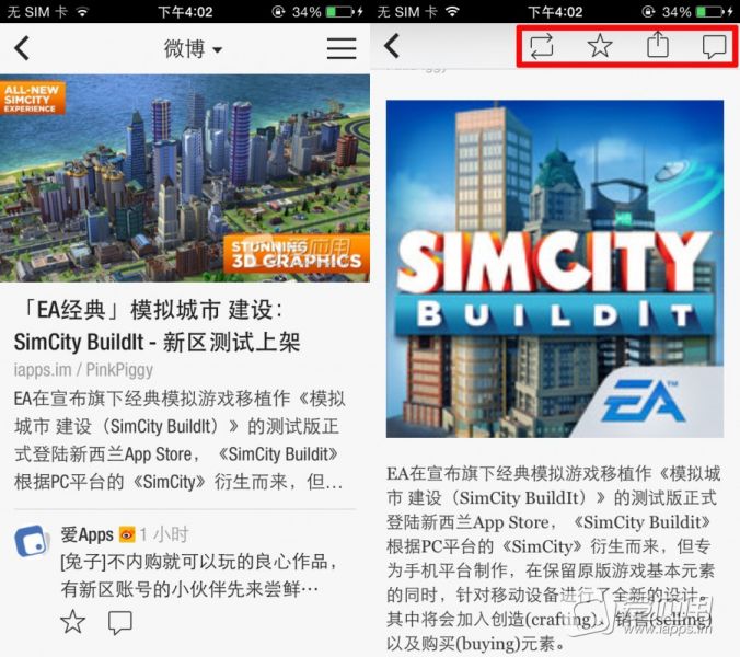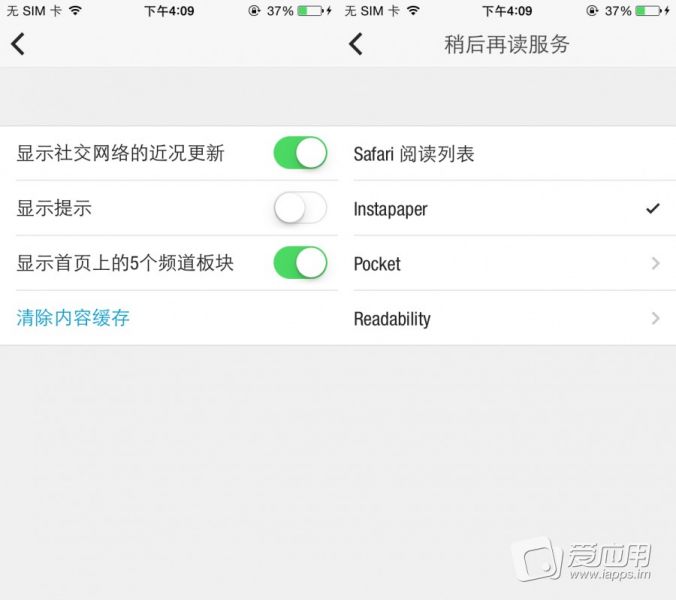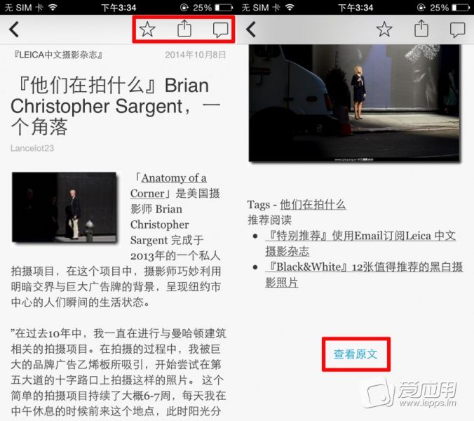 网页式排版:点击内容标题即可进入正文,点击下方的按钮可以点赞或查看该文评论。进入在文章正文后,界面非常的清爽,右上方有一排按钮,分别为“点赞”、“分享”和评论,点赞还评论都比较容易理解,下面来看一下分享里面的内容,它包括分享到短信,微博和人人网,添加到稍后阅读(包括Safari阅读列表、Instapaper、Pocket等,需绑定相关账号),Safari 浏览(和开启原文一样)和举报文章。
