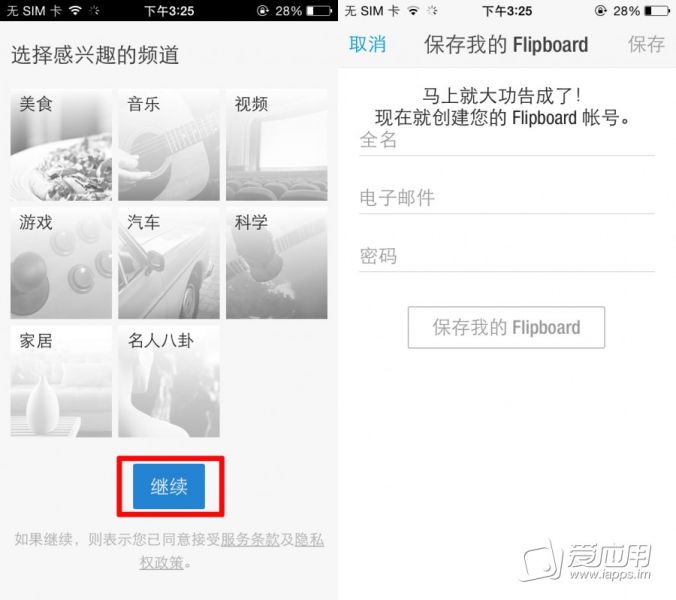 打开应用,你需要创建一个 Flipboard 账号,以便于在不同的设备上查看已订阅的内容。