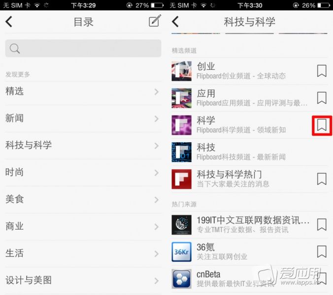 选择右侧的红色“红丝带”按钮,在弹出的目录页面中,可以看到“帐号”选项下面有很多分类,选择你感兴趣的分类,比如“科技与科学”,就会弹出它的子目录,每个目录后有个灰色的“标签”,轻按该按钮后会变成“已订阅”的字样,订阅成功!