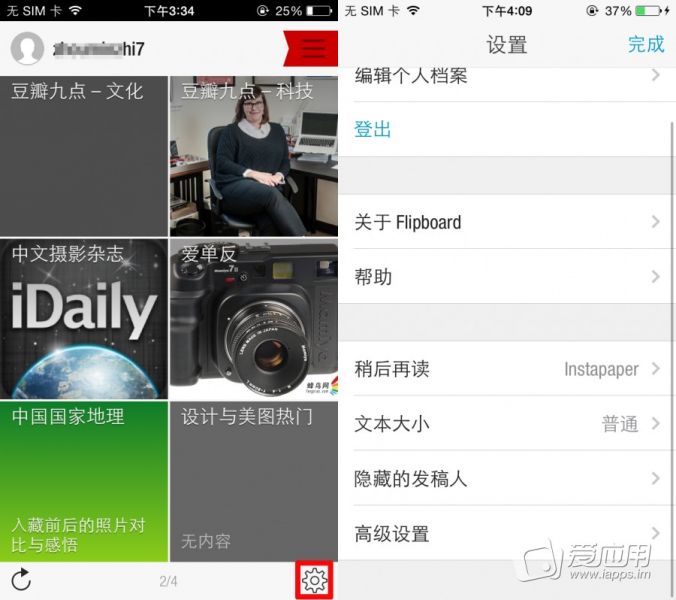 选择右下角的“齿轮”按钮,进入应用的一般设置。你可以在此编辑个人资料,包括头像,个人简介。设置中选择稍后阅读的应用(可以在此管理稍后阅读),文本大小,屏蔽的发稿人(前文已经提及这个功能了,如果你不想再屏蔽这位作者的话,可以在该项下将作者名单后的“√”取消)。