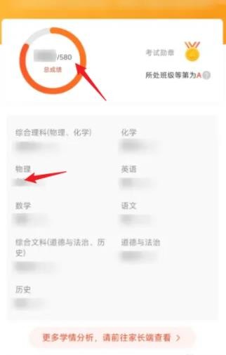 3、最后在学情报告界面,即可查询各科成绩、总分成绩。