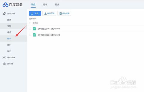 1.首先,将需要下载内容的种子文件保存到自己的百度云网盘,然后在网页上登录百度云,选择种子文件选项,然后我们就能看到我们保存的种子文件