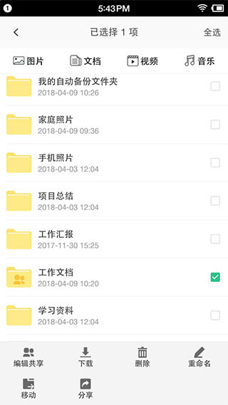 可以将文件夹设置为共享、取消共享。选择文件/文件夹后可移动、重命名、删除,选择文件后可下载。