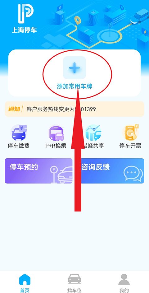 1、用户登录上海停车app后,点击首页的"+"即可进入车牌号添加页面。