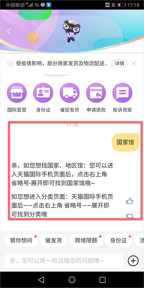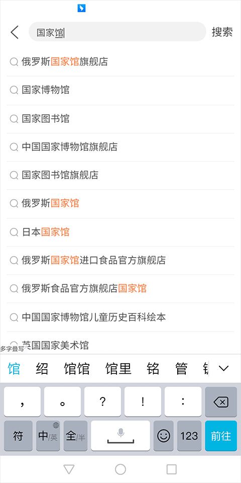 但是可以在天猫国际app首页中的顶部搜索框中输入"国家馆",输入的同时用户可以看到其下拉选项中有部分国家馆的旗舰店之类的选项目,用户可以选择一个点击进去即可