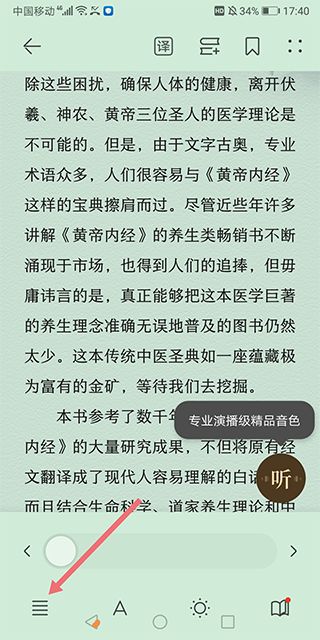 华为阅读最新版本支持本地书语音朗读功能,建议更新到最新版本使用。支持语音朗读的书籍,在阅读正文中点击屏幕中间,呼起设置菜单,在右下角会显示“听"字图标,点击即可使用语音朗读功能。