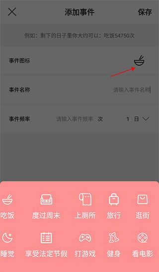 7、选择吃饭、健身、睡觉以及看电影等事件图标,设置事件名称和提醒频率,点击保存就可以啦。