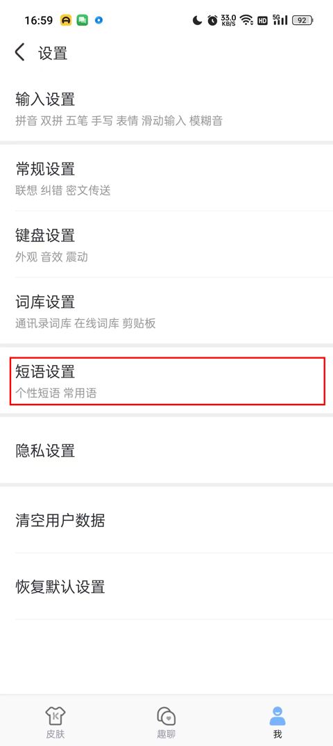 3、进入到设置页面之后,下方有一个短语设置,点击进入;