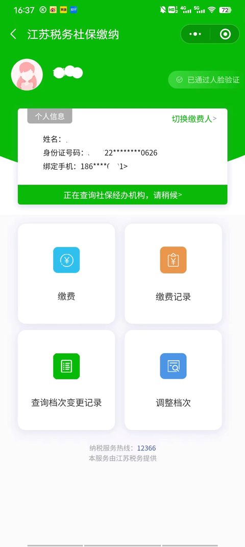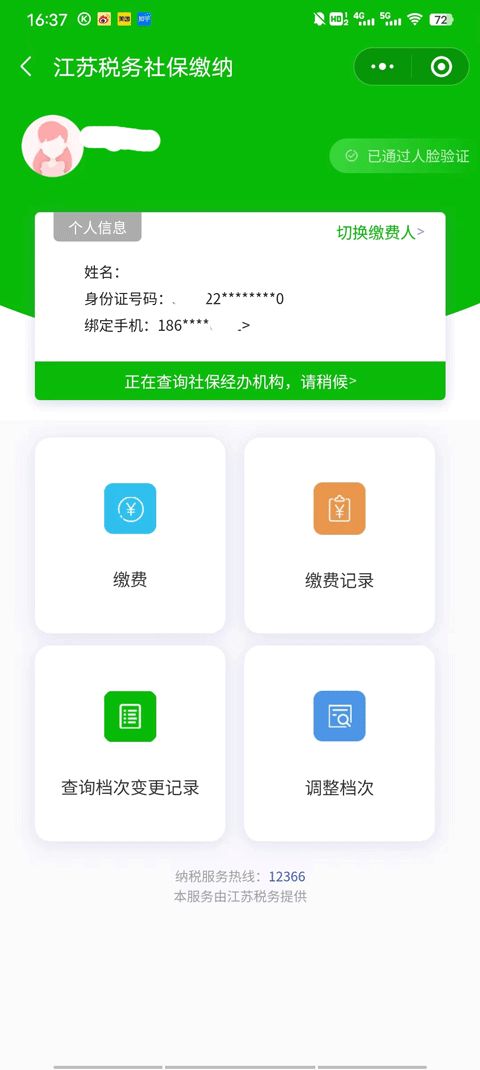 3、之后会转跳到江苏税务社保缴纳系统中,实名认证后,点击缴费记录,如果你是帮别人查询的话也可以点击切换缴费人;
