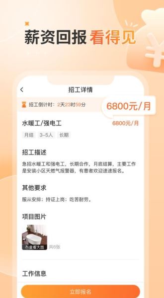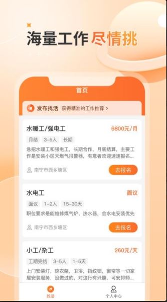 奇兵智工工人版最新版app是一款在线找活找工作的应用软件,为全国的装修工人打造的线上找活服务平台,可以随时寻找长期活、短期活以及等类型的工作,帮助用户找到最合适的工作,通过工作获得收入,这里有建筑工程、物流运输以及家政等行业的工作职位,在这里随时都能寻找到自己擅长的工作,无需到线下劳务市场也能得到满意的工作。在首页拥有很多的工作职位,可以查看发布的需求职位,从而随时报名,得到工作机会,每个工作职位都有详细的说明,方便用户了解工作要求以及技能要求等情况,从而提高用户的找活效率。很多职位都有明确的新资,可以提前了解能够得到的工作报酬,还能与招工的老板随时在线沟通,提前沟通好相关事宜,有需要就快来下载使用吧!