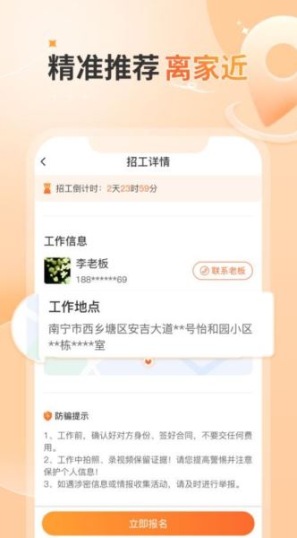 提供了招工老板的联系电话信息,用户可以随时获取电话与老板沟通;