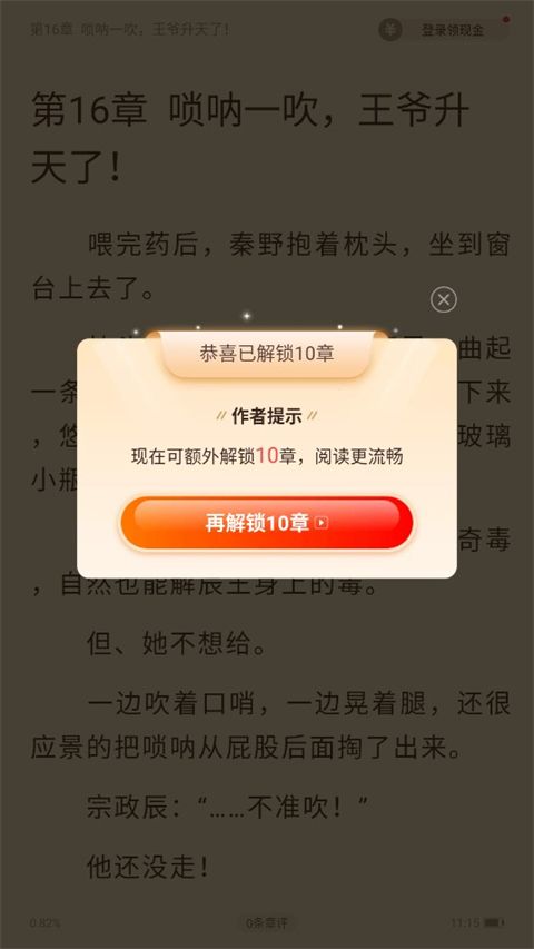 2、在看完广告之后就可以解锁10章内容,想要解锁更多可以继续观看广告或者开通会员。