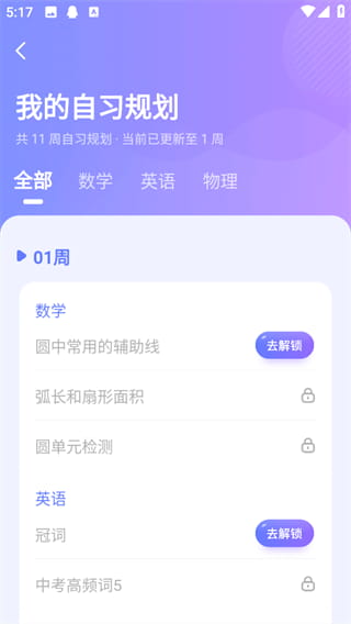 7、点击全部规划我们可以看到自习规划的整体。可以发现是涉及初三的所有课程内容,所以跟着自习规划学习会有很高的学习效率哦!