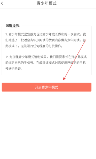 4、在青少年 模式页面,点击开启青少年 模式按钮即可。