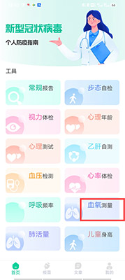 1、点击进入软件首页,里面为用户提供很多工具,如血压检测、心率体验、乙肝自测、血压测量等等功能,我们点击血压测量;