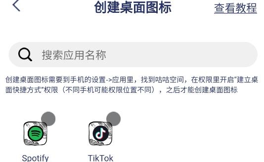 注意:创建桌面图标需要到手机的设置-应用里,找到咕咕空间,在权限里开启"建立桌面快捷方式"权限(不同手机可能权限位置不同),之后才能创建桌面图标