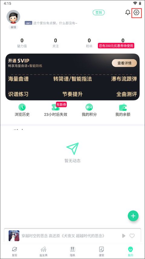 1、选择右下角的菜单栏我的,然后点击右上方的齿轮按钮进入设置界面。