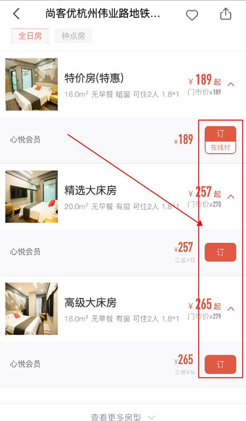 然后用户就可以选择自己要预定的房型,选择好点击右边的"订"即可。