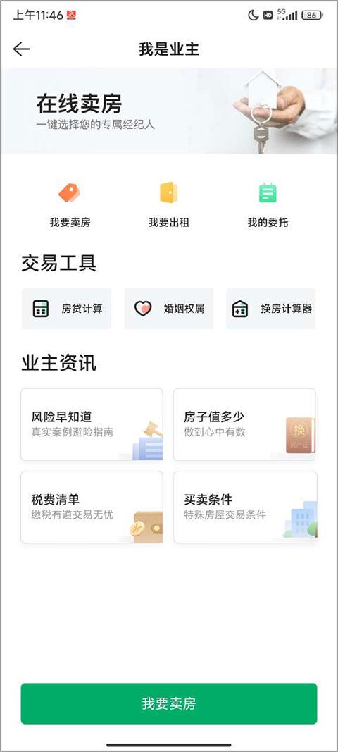 1、下载安装好链家app,进入首页点击我的,在我的界面找到我是业主按键并点击。