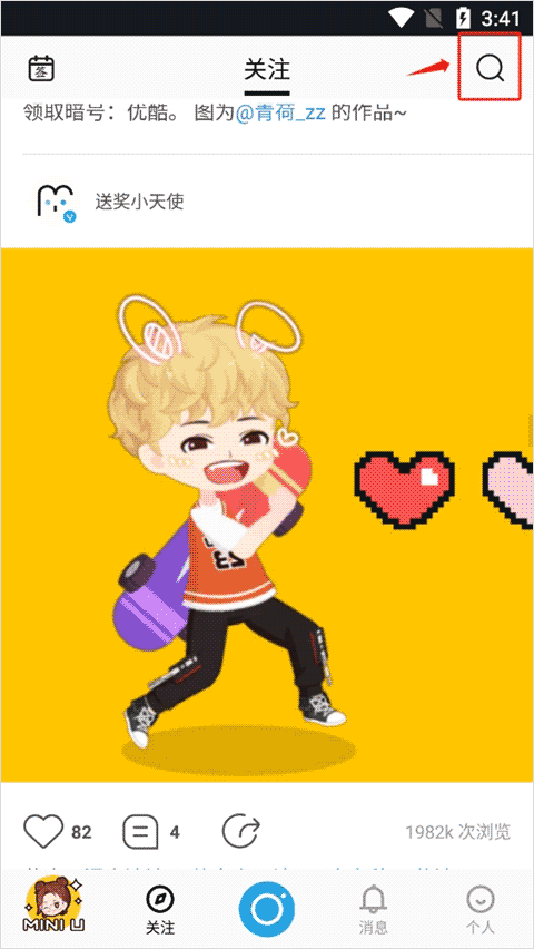 1、你可以主动邀请好友,在广场页点击右上角"搜索"键。
