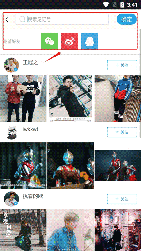 3、当然你也可以在足记结交好友,在广场页发现好看的图片和用户,可以点击头像旁的"关注"或"+"进行关注。