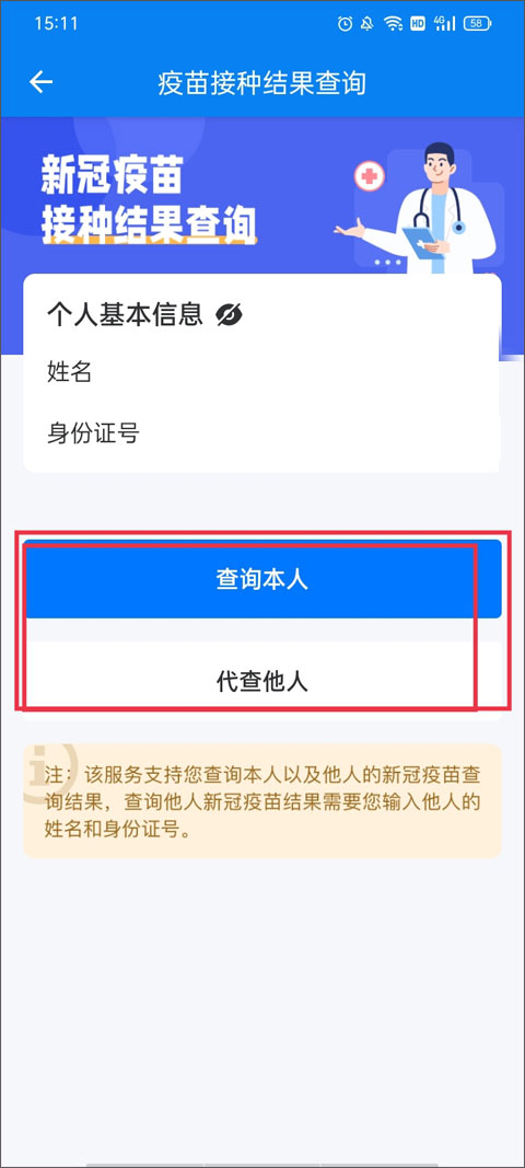 3、在这里,你既可以查询本人的疫苗接种信息,也可以查询自己家人或朋友的信息。