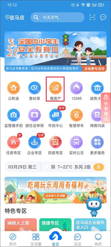 1、同样还是在首页这个界面,点击上方的"查房产"服务。
