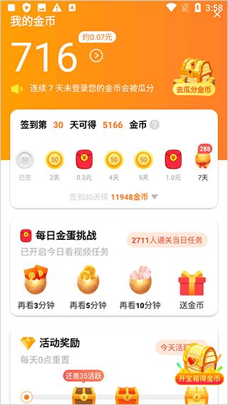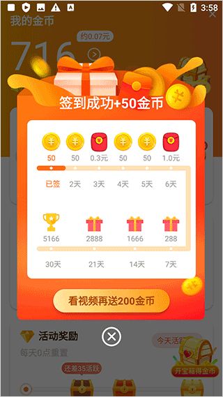 3、除了签到赚金币以外,还可以通过做任务活动和看视频赚取金币