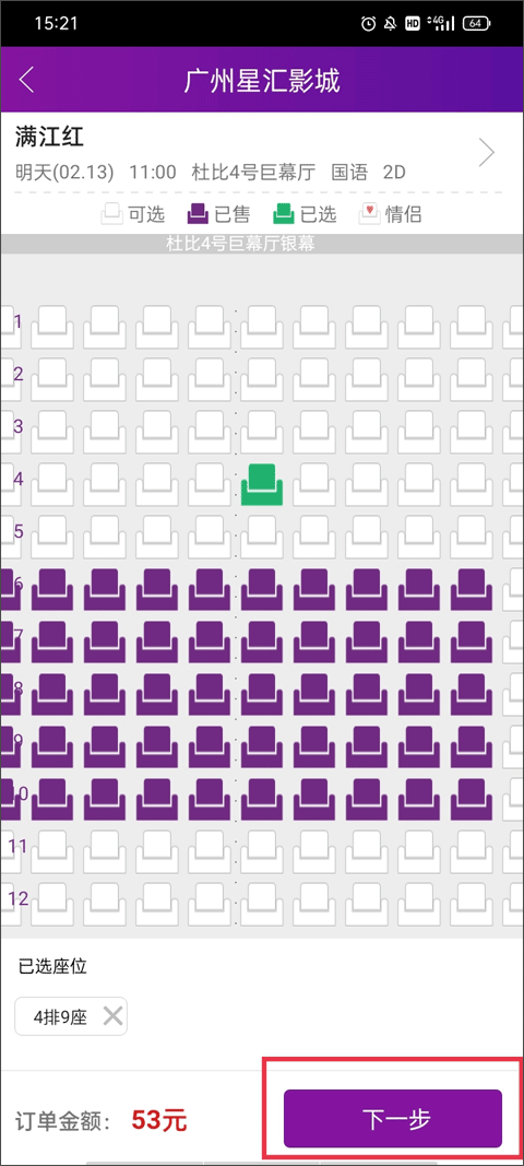 选中电影院与排期后,进入选座预览页面,拣选希望订座的区域,进入含具体座号的局部放大图,点击下一步进入支付页面。