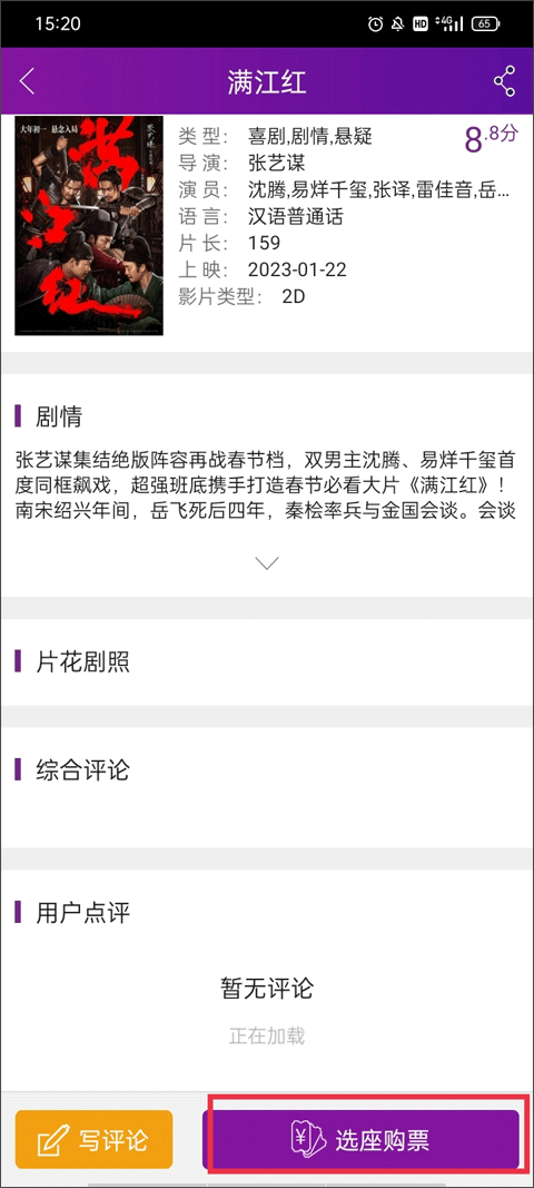 进入主界面,左右滑动"海报"选中影片,查看电影详细信息,点击"选座购票"查询该影片排期。