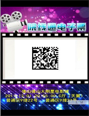 成功订票后,正常情况下,一般5分钟内手机客户将同时收到普通短信和二维码彩信两种格式的电子票。(部分客户手机可能不支持彩信功能,只能收到普通短信电子票。)内容包括:电影院名称、座位、电影名、时间、地址等。