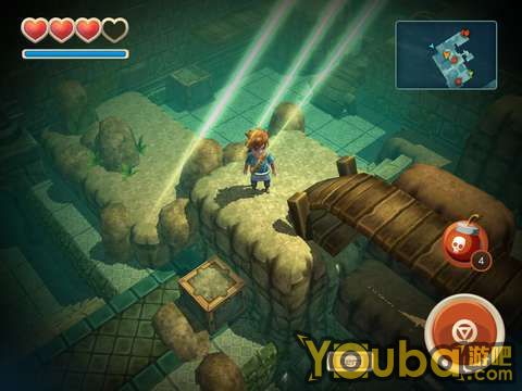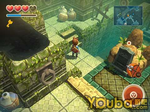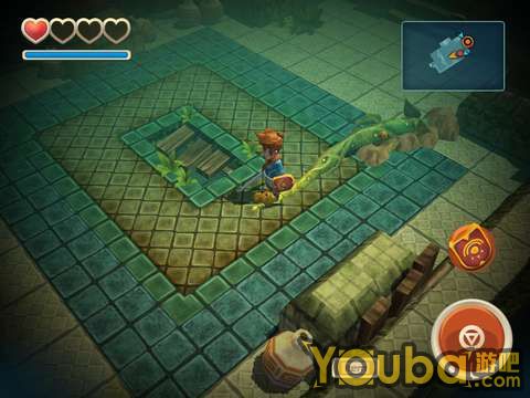 下水游过去,击败一个骷髅人,就可以看到控制水位的开关了。打开开关之后水位就会降下去,这时用户需要走到如图处,把箱子推下去,然后由此跳下,来到森林神庙的地下室。