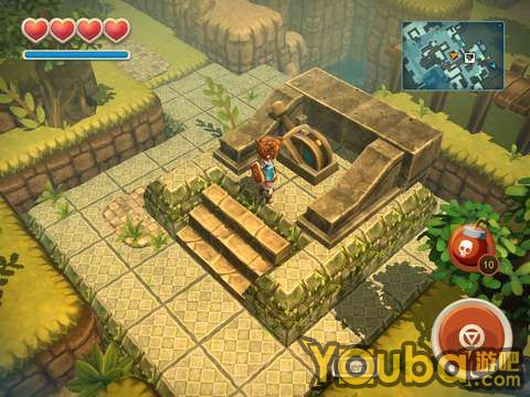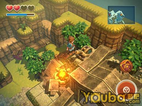 通过之后继续往前,会走到一个洞穴门口,但是有障碍物挡着,进不去。这时候先从左边的楼梯上去,然后把箱子推下来,直走就能找到一个机关开关,打开机关就可进入洞穴。