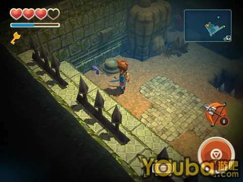 直走会遇到一个锁着的铁门,这时往右走,打败骷髅怪,把箱子移动到如图处,然后往前走能够拿到一把钥匙(PS:带着铁面具的鸟用武器打是无效的,可以用魔法打碎它的面具之后再用武器打)