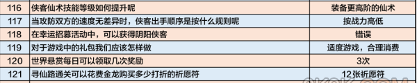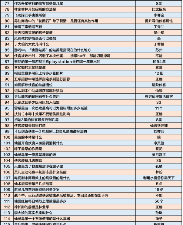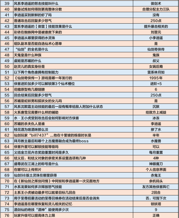 1.新仙剑奇侠传之挥剑问情仙剑问答答案大全如下,玩家们可以对照答案。