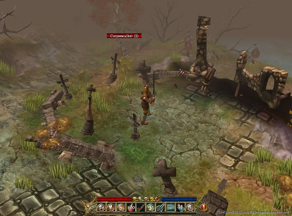 第一章。刚一进游戏角色就会被几个骷髅围殴,没什么好说的,挡我者死,A键一顿按全部搞定。另外,之前看到有人说第一个怪就掉了金装。。这个游戏所有小怪都是有机会掉好装备的,RP好能掉金装甚至绿装也会掉。至于红色装备本人杀了无数怪,只有3章的火BOSS掉过一次,当时玩的FS,掉了一件需要力量70的。。当时一兴奋,以为几率很大就重新读档想刷个法师能用的出来,刷了无数次后悲剧的发现再没见过红装,而且绿装也专掉战士的。。。好了进村老头(名字忘了,就叫老头吧)给的第一个任务就是叫你到村子附近搜刮,2个塔下分别有一个木箱,里面有点药水和装备,具体位置如下: