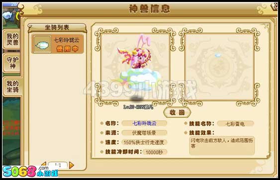 在神兽面板的“我的坐骑”里可以召唤出来~~~速度是150%哟~~~