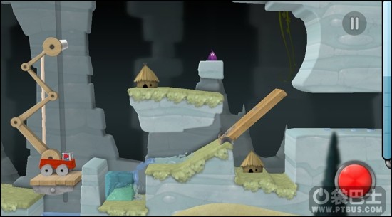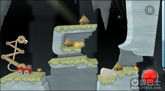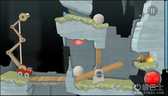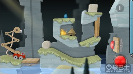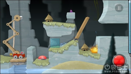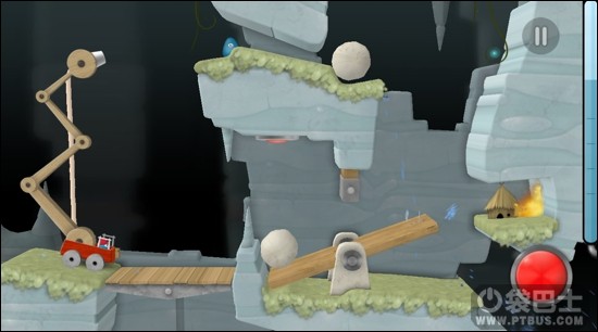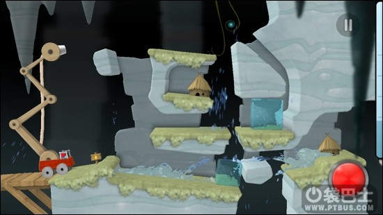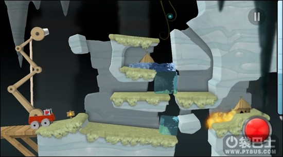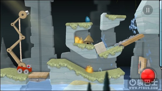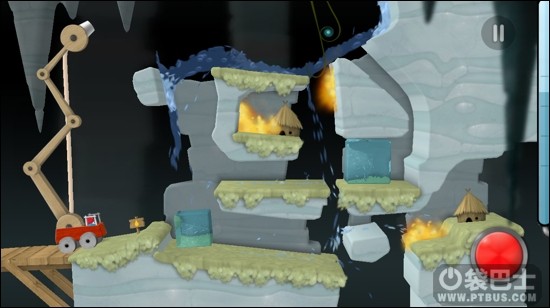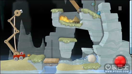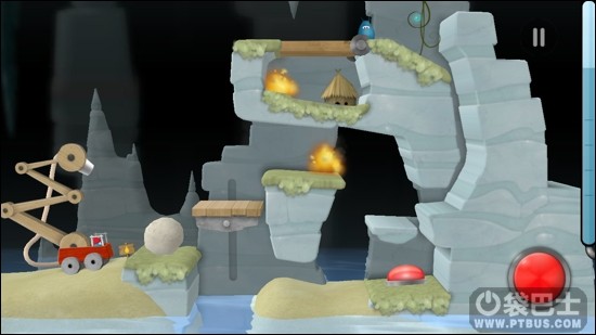 下一个场景的通关技巧和之前通过的关卡有些类似,通过水力将石球推到升降机的木板上,然后移动到右下方的红色按钮处,压下。上方的木质挡板机关打开,就可以很轻松的完成灭火任务了。