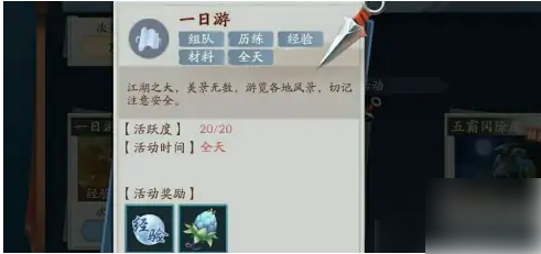 比赛前2天也就是最肝胆相照的2天,伴随着关卡逐步开启一日游、江湖画本、门派修炼、门派授业、影宗悬赏、风云录40关,该关卡段内的各项活动基本上都已经全开,同时也正是第1天、第2天掌握升级速度最为关键的时候,但因为活跃度问题主线任务经验与奖励都没有江湖画本、风云录、组队任务为首选,单人次之,此阶段经验副本可在任务栏中查找获得。