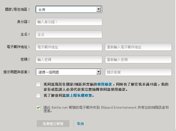 4、有登入或建立帐号!建议使用全新的帐号。当然,以前有TWWOW的朋友也可以使用你的WOW帐号登陆。没有帐号的朋友们,我们来选择建立帐号。然后你会看到填写用户资料的界面。