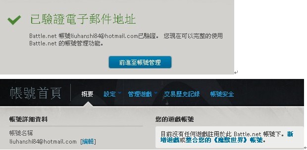 7、验证后我们跳转到暴雪台湾战网的界面,点击前至帐号管理,你将跳转进你的台湾战网通行证的管理页面。