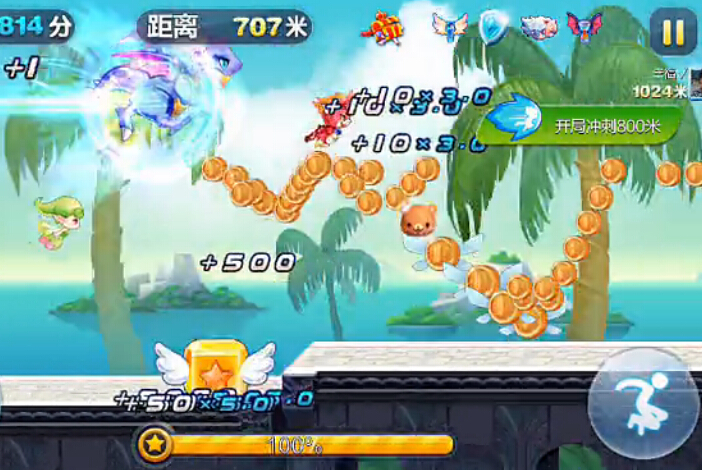 技能:踩怪5倍得分、奖励关卡2倍得分、开局冲刺800米、终极冲刺