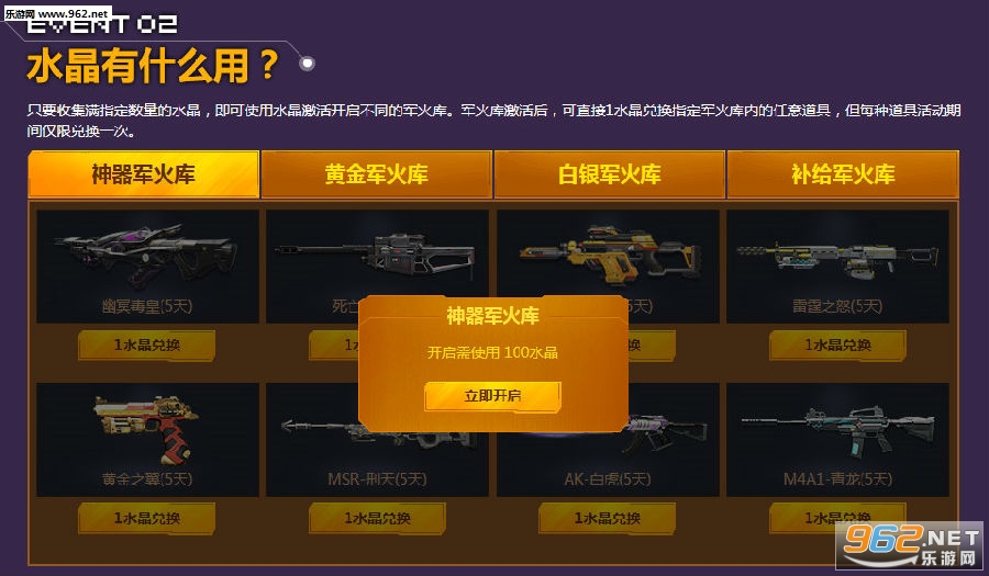 只要收集满指定数量的水晶,即可使用水晶激活开启不同的军火库。军火库激活后,可直接1水晶兑换指定军火库内的任意道具,但每种道具活动期间仅限兑换一次。