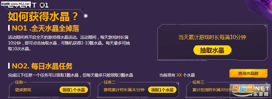 活动期间将开启全天的游戏得水晶活动。活动期间,每天游戏时长满10分钟,即可点击抽取水晶,可随机获得1-10颗水晶。每天最多可抽取10次水晶。