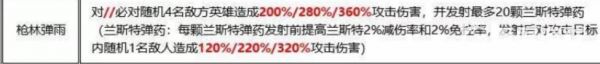 1、枪林弹雨:可对随机4名敌人造成一定比例的攻击伤害,这个技能的攻击伤害比例在一众英雄中算非常高的了,更别说还是AOE伤害。同时,他还会追加发射兰斯特弹药,这个弹药发射前提高兰斯特2%的减伤率和免控率。