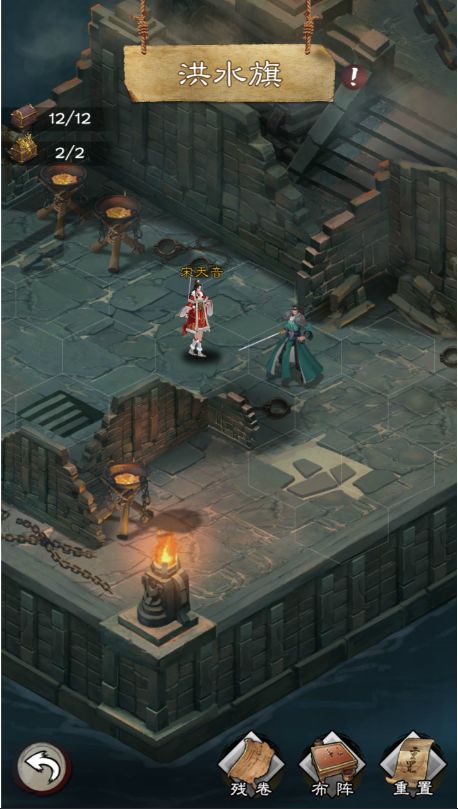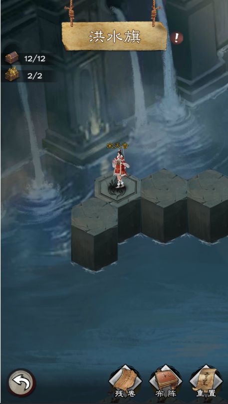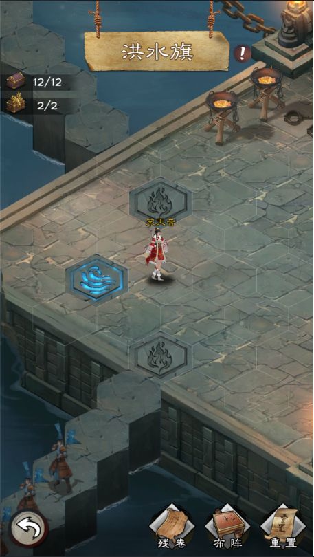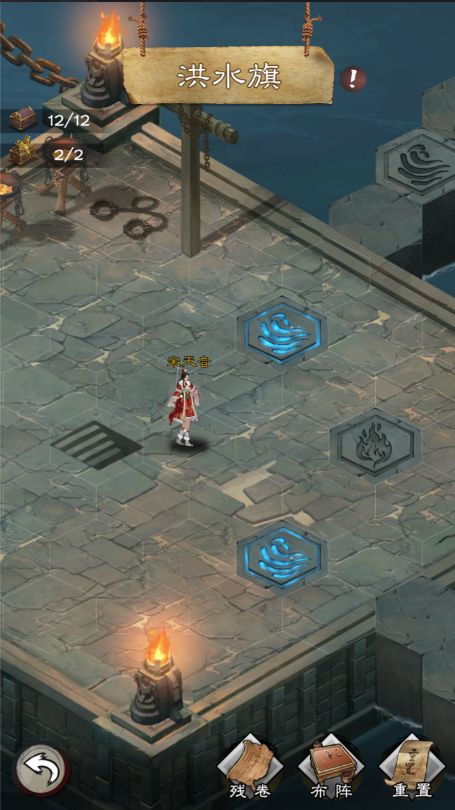 进入洪水旗,地上有6个图标,3水3火,分别对应一条道
