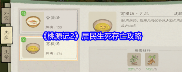 吃药的时候会显示红条,红条越长,病的越重,劳动力越底,红条满了也别怕,村民不会死的,只会老死和被兽潮打死,只不过在前期,尤其是第一天,劳动力太低了,效率太低,效率低了干啥都完蛋,所以上文才说要多买葛根汤熬过第一天,第二天开始可以大量制作葛根汤了,就可以不买了,所以别忘了把能采集的需要大量用的资源采集完,别制作的时候发现不够用,早干嘛去了。